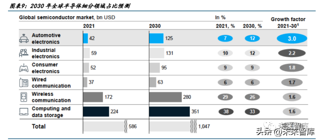 根據 Mckinsey & Company 數據,2030 年全球半導體市場規模將達到 10470 億美元,汽車 半導體占比將從 2021 年的 7%提升到 2030 年的 12%,工業占比將從 2021 年的 10%提升到 2030 年的 12%,而通信及消費電子的占比將下降。