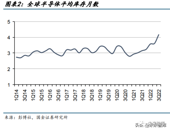 國內與國外庫存均達到歷史最高水位。我們看到 2022 年第三季度全球半導體平均月數上 升到 4.16 個月,國內半導體設計廠商的平均庫存月數上升到 8.62 個月,都已超過常見的 4 個月庫存水位線。國外內廠商的庫存月數持續上升,終端庫存處于歷史高位,疊加消費 市場的需求持續萎靡,供需調整腳步漸近,半導體行業或將開啟主動去庫存的主旋律。