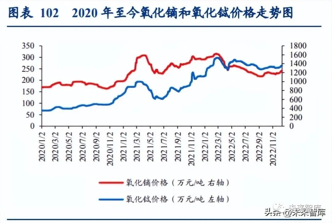 稀土下游應用所需的主流品種氧化鐠釹在經歷了過去多年不到 30 萬元/噸的低價之后, 從 20 年底價格中樞逐步走高,在 22 年初由于階段性的供需不匹配疊加疫情等原因,達 到了高點的 110 萬元/噸,隨后隨著國家配額的穩步釋放以及疫情進一步擴散導致的需求 邊際放緩,價格中樞逐步下移,目前價格中樞穩定在 65 萬元/噸以上。