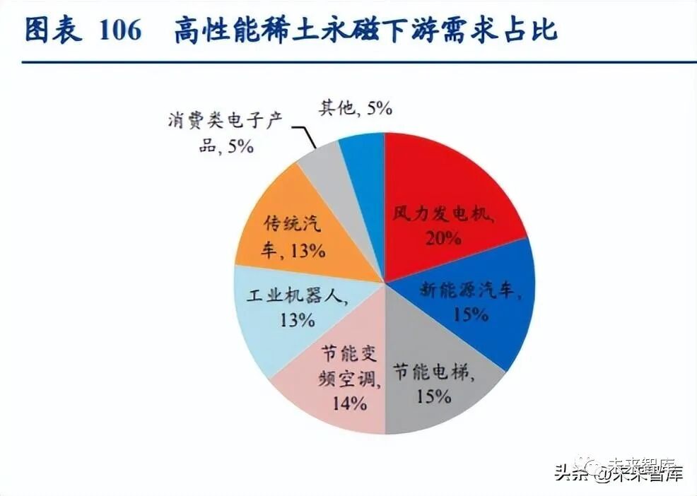 中國稀土消費量中永磁材料占比超 40%。根據中國產業信息網數據顯示,2018 年中國稀 土消費結構永磁材料占比超 40%,而隨著一風電、新能源車、變頻空調等為主的高端稀 土永磁的高速發展,高性能稀土永磁的占比將不斷擴大。