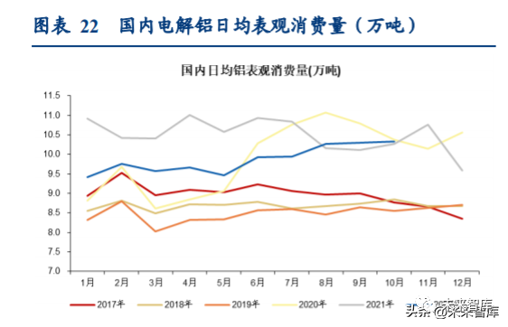 外需前高后低,內需緩慢復蘇。2022 年由于海外的減產,海外的鋁需求缺口需要由國內 的出口來彌補,鋁材出口量的累計同比在 6 月達到了 34%的高增長,歐洲和北美的現貨 鋁錠溢價已經超過前一峰值 2015 年;但是歐洲能源和加息的問題同樣也會對歐洲需求造 成沖擊,2022 年 5 月之后,鋁錠現貨溢價高位回落,中國的鋁材出口也逐月下滑,驗證 了外需承壓。但與此同時,國內電解鋁表觀消費量從 5 月的低位 9.46 萬噸/天逐漸回升, 10 月的表觀消費量升至 10.34 萬噸/天,國內消費正處于底部復蘇周期。