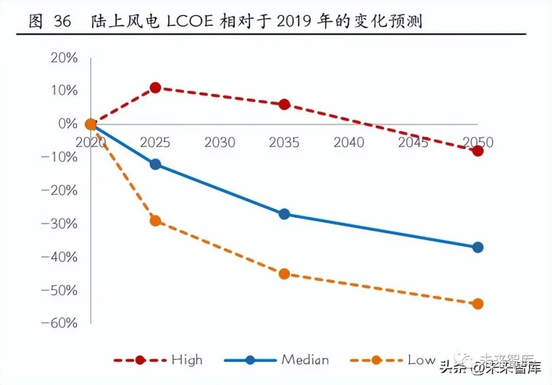 平準化度電成本預計未來仍有下降空間。2020 年,Ryan Wiser 等人集合全球 140 名風能專家見 解在《Nature Energy》雜志上發布了最新的風電成本的預測,研究表明至 2050 年,受技術創新、 工業成熟、競爭激勵和鋼鐵成本、貸款利率等因素的影響,風電成本將下降 37%-49%。經 97 位 陸上風電,71 位固定式基礎海上風電的專家預測,陸上風電的高位成本(典型 LCOE 更高的概 率只有 10%)至 2050 年相比于 2019 年將下降 8%,低位成本(典型 LCOE 更低的概率只有 10%) 下降 37%,中位成本(LCOE 更高或更低的概率相同)下降 54%;固定式基礎海上風電的 LCOE 分別下降 26%、49%、64%。