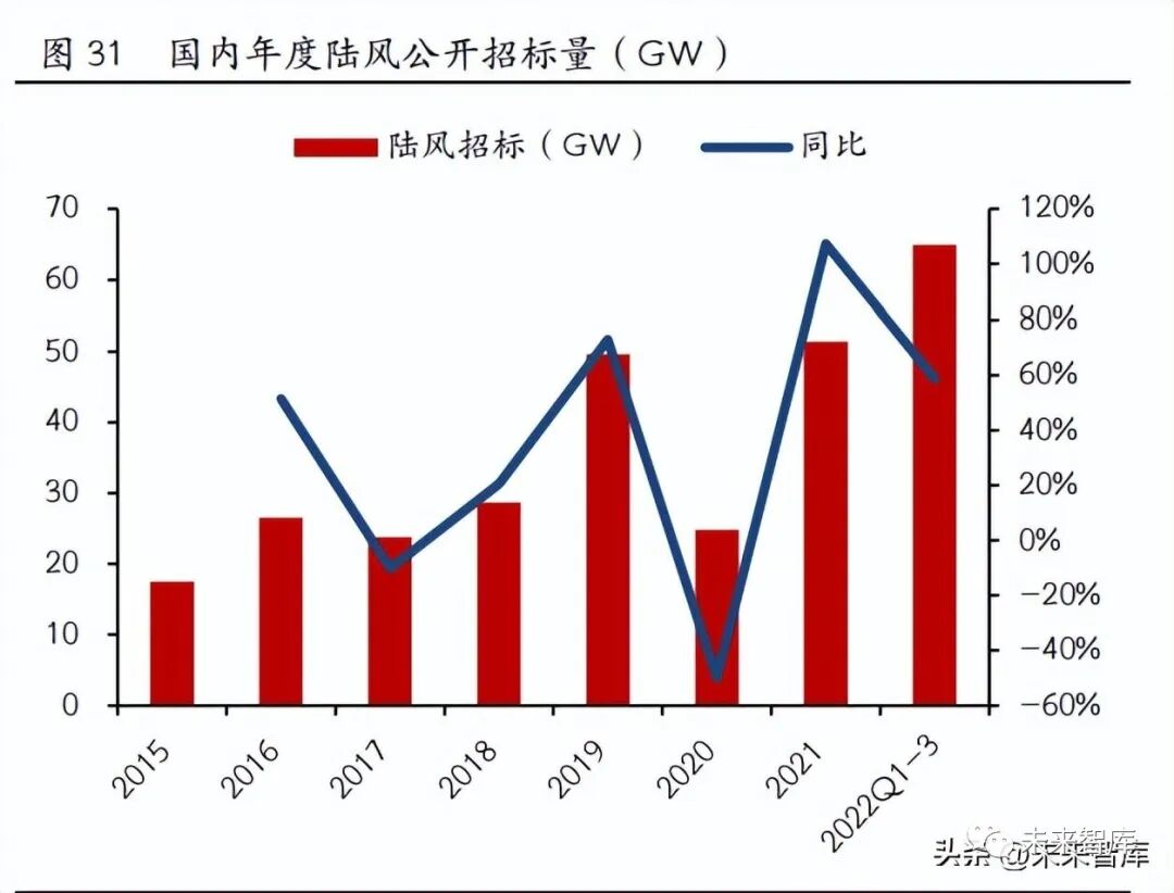 國內海風招標規模超過 11GW,同比大幅提升。根據金風科技統計數據,按市場分類,2022 年 前三季度陸上新增招標容量 64.9GW,較 2021 年同期提升 58.7%;海上新增招標容量 11.4GW, 較 2021 年同期大幅提升 1040.0%,主要原因是受到前期基數較低的影響。