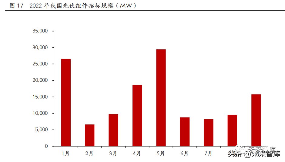 2022 年前三季度我國光伏組件招標超 124GW,較 2021 全年多近 3 倍。根據 PV-Tech 的統計數 據,中國 2022 年前三季度光伏組件招標總規模已超 124GW,與 2021 全年招標量相比超出近 3 倍。按照 PV-Tech 的預計,2022 全年我國光伏招標規模將突破 150GW。2022 年上半年光伏組 件市場整體呈現供需兩旺的態勢,但在硅料產能受到意外因素影響,供需緊張進而帶動價格上 漲,導致組件的招標規模有所放緩。其中“五大六小”發電集團 1-9 月累計招標約 95GW,占 總招標量近 80%,是國內電站招標的主力軍。