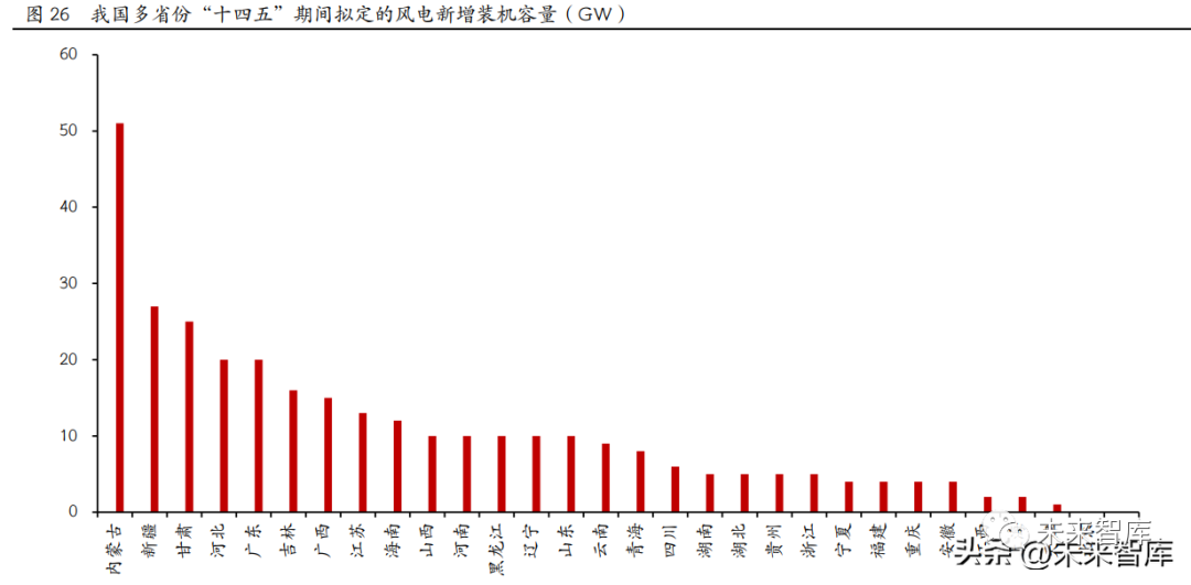 我國各省份規劃十四五期間的風電新增裝機已超過 310GW,內蒙古遙遙領先。根據金風科技統 計,近期至少已有 29 個省份發布了“十四五”遠景目標綱要、能源/可再生能源發展規劃或綠色 低碳循環體系等文件,包括內蒙古、新疆、甘肅、河北、廣東、廣西、吉林、江蘇等在內的多省 市,根據已公布的規劃數據,十四五期間風電新增規劃裝機達到 313GW。按照相關發展規劃, 未來新增裝機規模最高的是內蒙古,預計達到 51GW,顯著領先其他省份;另有新疆、甘肅、河 北、廣東等省份規劃新增風電裝機容量超過 20GW。