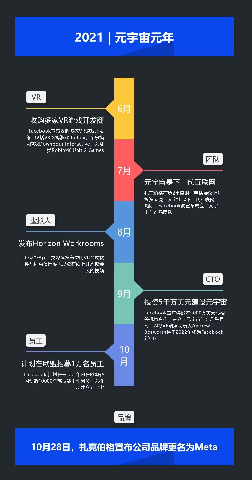 今年被業界稱為元宇宙元年,扎克伯格在一次電話會議中16次提及“元宇宙”,并計劃在5年內擦除Facebook的社交媒體基因,徹底轉變為一家元宇宙公司。聯想到該公司的內憂外患,社交媒體的確不是扎克伯格想要的未來了。