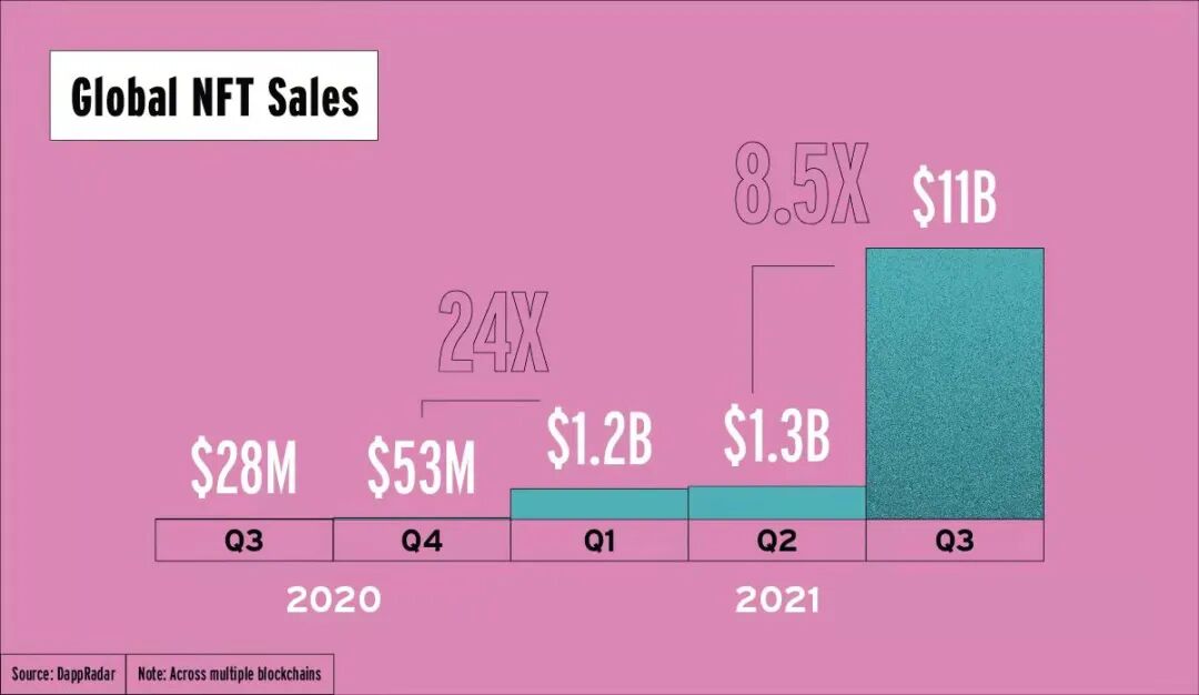 最后便是藝術家、公司和機構全都蜂蛹而入的NFT(姑且可以理解為有價值的數字藏品)產業,今年第三季度以令人乍舌的110億美元成交額繼續刷新歷史新高。