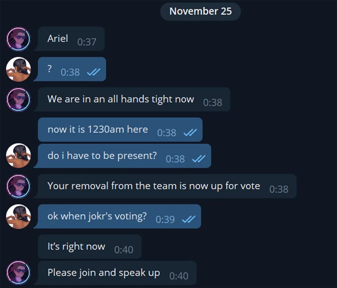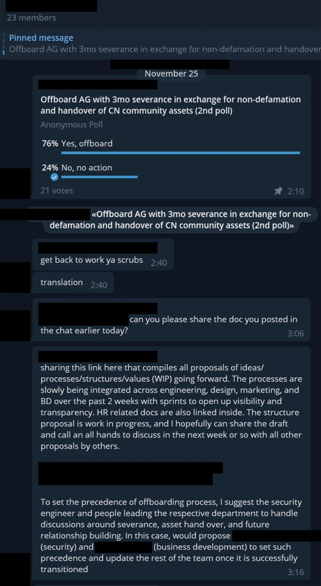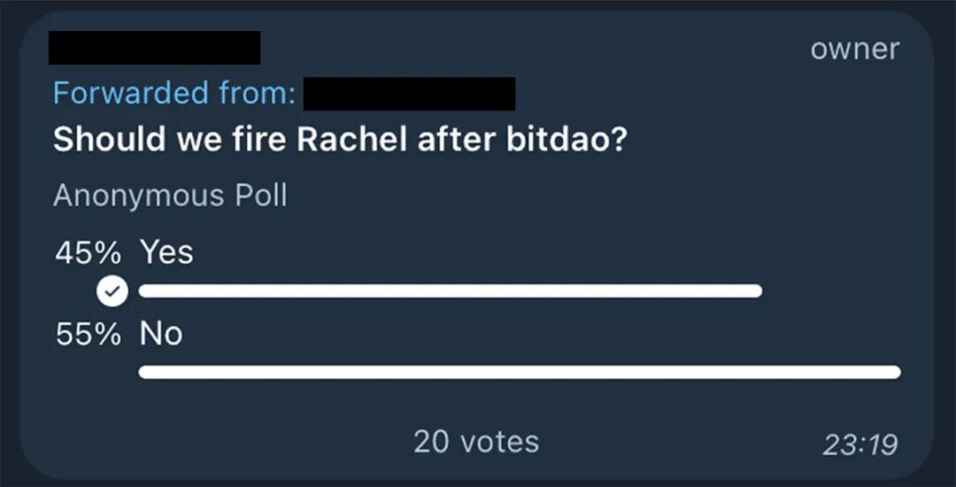 “Omakase啟動了民意調查,Joseph則置頂了該調查,隨后Rachel開始對她進行虛假指控。不久之后,AG的谷歌訪問被取消了。”一位匿名人士告訴rekt.news。