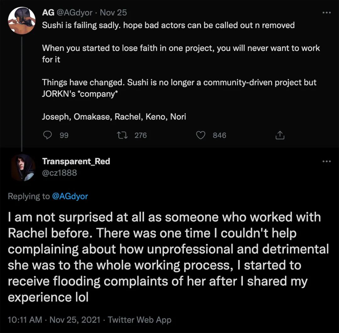 當其他團隊成員對此提出質疑時,Omakase表示分配不均是0xMaki的想法,而事實上是Rachel將0xMaki當作替罪羊,而0xMaki實際要求將所有獎金直接分配給xSushi持有者。