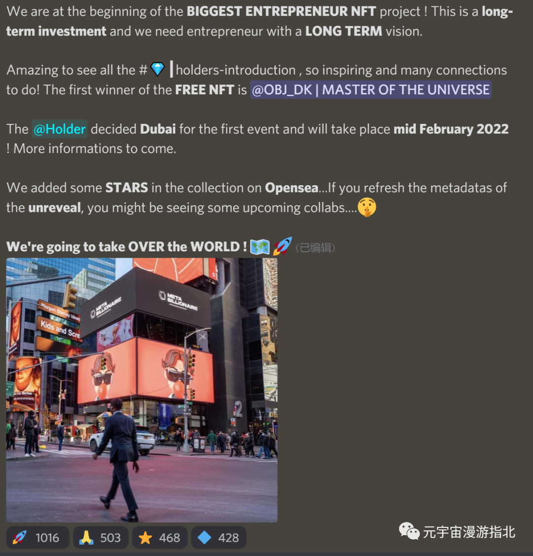 標榜是企業類的NFT,世界各地舉辦商業活動,提供各種ICO/IDO機會給NFT持有者,就是權益類NFT的玩法,至于怎么讓你變成億萬富翁就再觀察了...
