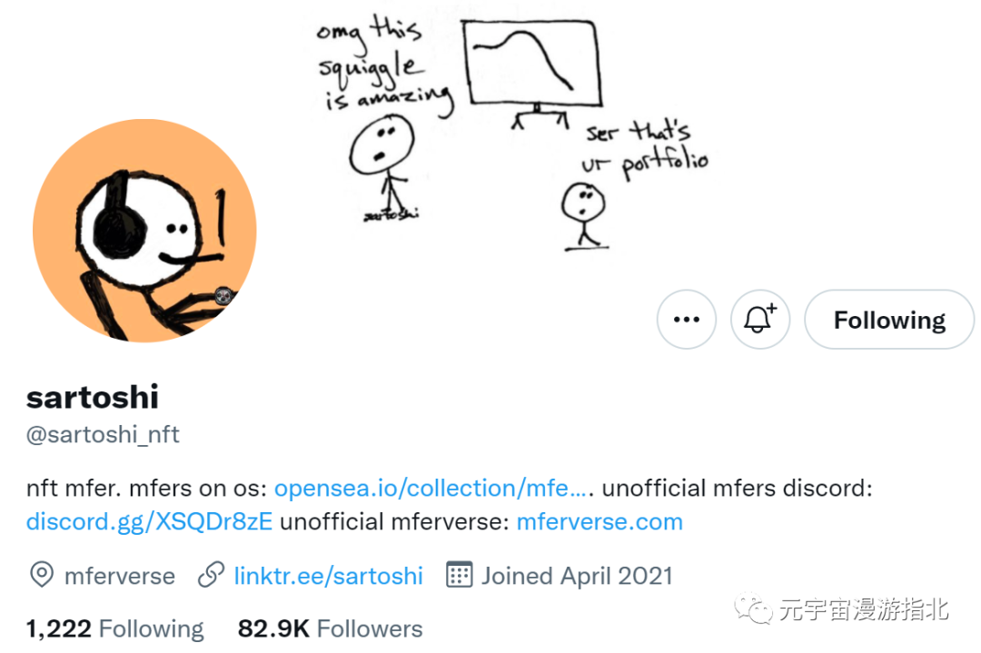 大網紅Sartoshi的手繪項目,大佬們都相繼關注(包含Zeneca_33等都有入手),沒有roadmap沒有Discord沒有版權,mfers們都特別溫馨,twitter都會互相關注。