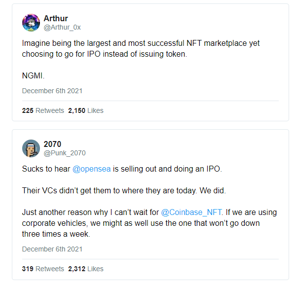 - 一個虛擬增強現實(AR)初創公司Anima希望將metaverse和IRL連接起來,他們發行了HASE MN:01 Mirror,一種數字雕塑,也是通往元宇宙的一個通道。- 開放地球基金會推出了名為OceanDrop NFT的全息圖NFT,籌集的資金將用于一個名為OpenOcean的項目,該項目目的是支持當地非政府組織和公園護林員。- 聯合國兒童基金會正在推出一個名為Patchwork Kingdoms的NFT系列,以慶祝聯合國成立75周年,并且為互聯網學校籌集資金。- 百事可樂推出了其創世NFT系列Mic Drop,不到一分鐘就售罄了。- OpenSea聘請了Lyft的CFO Brian Roberts。而且外界收到了一個IPO的暗示(因為新的CFO說他正在準備公司即將到來的IPO工作),但這引起了藏家的強烈不滿,他們預計OpenSea的代幣會因此價格下降。我不得不同意。![]()