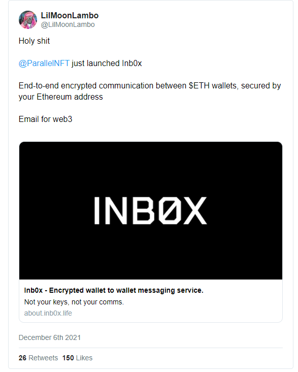 我想從我上周讀到的一份令我興奮的公告開始。基于NFT的游戲Parallel背后的團隊為以太坊錢包出了一個端到端加密信息傳遞服務,叫做inb0x。美國人一般習慣多用iMessage,然而在歐洲,很多人主要喜歡用WhatsApp。當然,作為技術倫理愛好者,我不喜歡我的消息被監視。在一篇博文中,Parallel將inb0x描述為“為web3所造的簡單通訊工具”,用戶們可以“安全地用他們的以太坊地址進行通信”。這解決了一個大問題,web3中缺乏的通訊交流渠道。當我們在web3平臺上交易時,我們只能在Twitter和Discord進行交流。我迫不及待地想要看這個項目走向成熟!接下來就是:Web3 Discord。