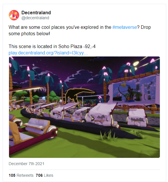 - Decentraland將作為贊助人加入到Blender開發基金會。- 加密藝術博物館即將推行一個可以使他們在任意虛擬世界創建展覽空間的NFT項目。MOCA的技術總監說:“我們假設會出現很多虛擬世界。我們希望自己出現在那里,我們希望能有更開放的API,這樣所有這些世界就可以從一開始就為其提供有營養有價值的內容和藝術展覽。”