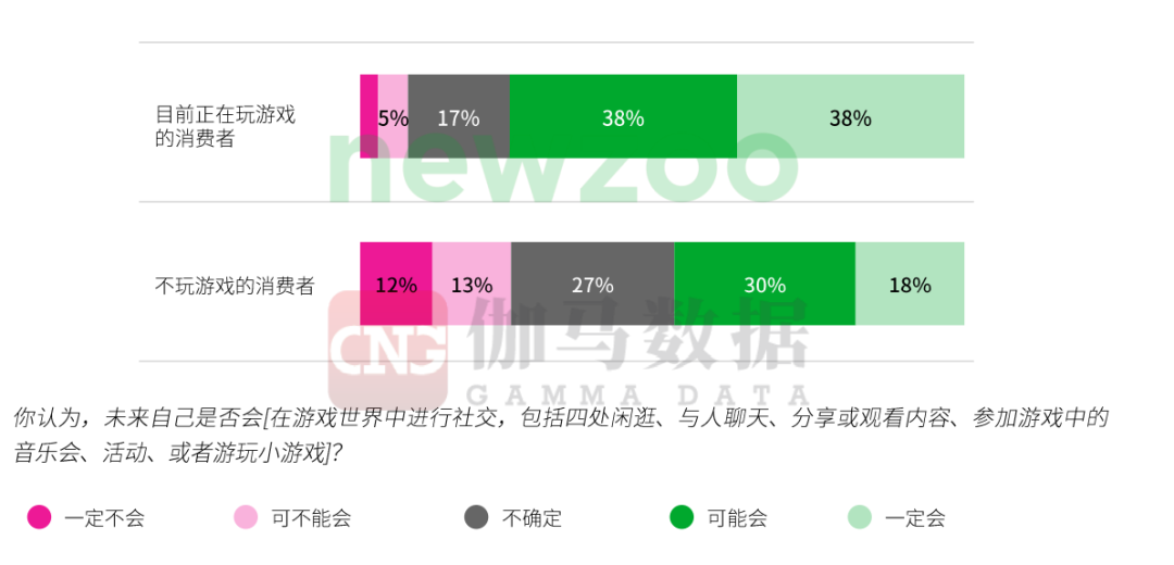 游戲玩家對元宇宙類型游戲世界的興趣極高,一定不會嘗試的比例僅2%;而非游戲玩家一定不會嘗試的比例為12%。