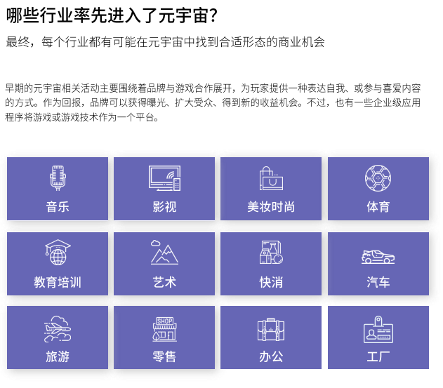 如果說游戲是一個元宇宙的載體,那早期的元宇宙,將會圍繞品牌與游戲展開合作,音樂、影視、體育、快消、旅游等幾乎每個行業都可以在元宇宙中找到合適的形態商業機會。