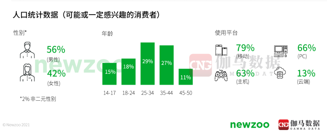 在14-50歲的消費者中,當被問及對于在元宇宙類的游戲世界中閑逛和一般社交的潛在興趣時,美國與中國消費者對這個想法持開放態度,尤其中國消費者對此感興趣的人數占比最高,其中有近45%的消費者可能存在興趣,33%的消費者一定存在興趣。并且在這些潛在興趣較高的消費者中,25到44歲的消費者興趣度最高,男女比例幾乎持平。他們平常使用平臺多為手機與PC端。