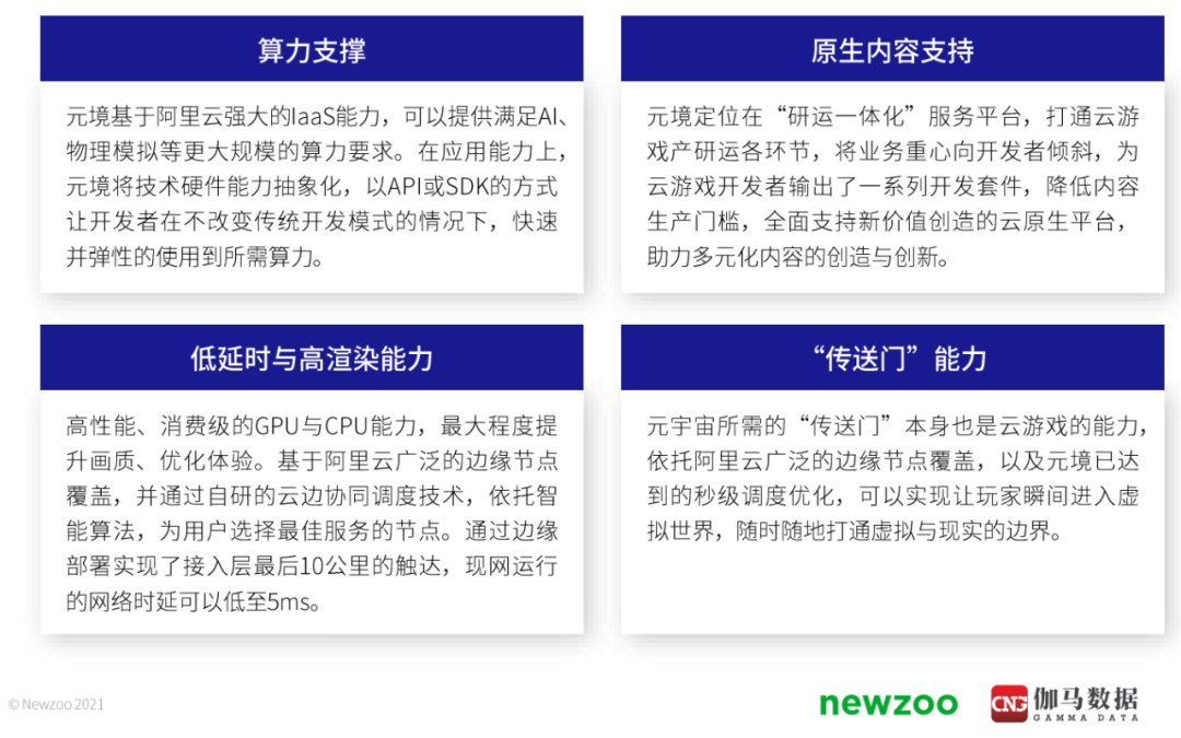 與世紀華通、中手游等游戲廠商的類型不同,元境是阿里云游戲領域研運一體化的服務平臺。目前,該平臺在云游戲領域已經實現了3D開放世界游戲的跨端發行、頭部手游渠道的云化發行、大屏終端廠商的云游戲平臺、大型SLG游戲的微端買量等多個頭部場景的實踐,并積累了豐富的技術應用經驗,而云游戲相關技術是元宇宙能夠實現的重要技術支撐。在未來,元境將通過對云游戲技術不斷深耕,推動元宇宙底層技術的發展。