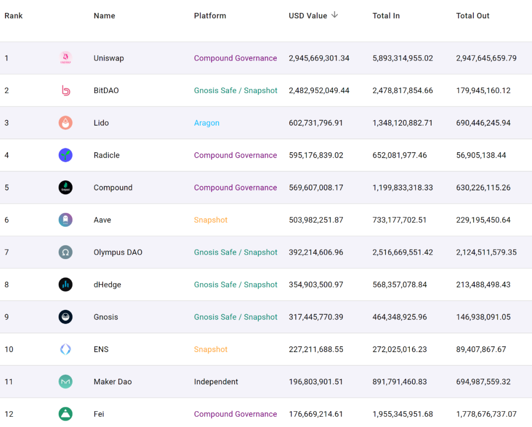其中,資金管理規模最大的DAO組織分別是Uniswap(29.4億美元)、BitDAO(24.8億美元)、Lido DAO(6億美元)、Radicle(5.9億美元)、Compound(5.7億美元)等。