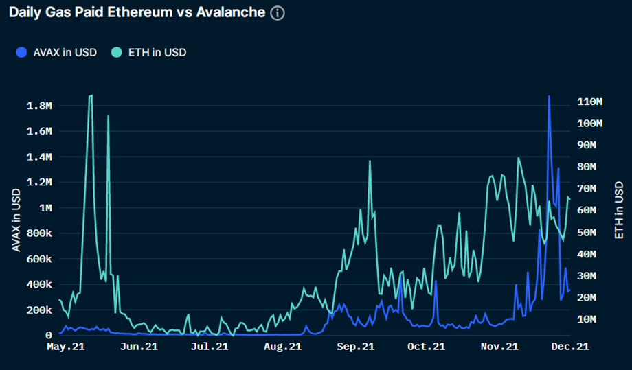 該比率從 8 月初的 1% 上升到 11 月 26 日的峰值 54%。為了突出 Avalanche 的表現,讓我們參考上一張顯示每日 gas 成本的圖表。11 月 26 日,在 AVAX 上支付的每日 gas 為 1,311,682 美元,而在以太坊上則為 51,389,748 美元。雖然 AVAX 當天的交易量占以太坊交易量的一半以上,但處理這些交易的成本比以太坊等價物便宜 20 多倍。這種對比突出了 Avalanche 網絡以一小部分成本所體現出的性能。