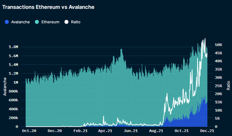 Avalanche 和以太坊之間的交易比率一直在顯著增加,特別是自 8 月份以來。