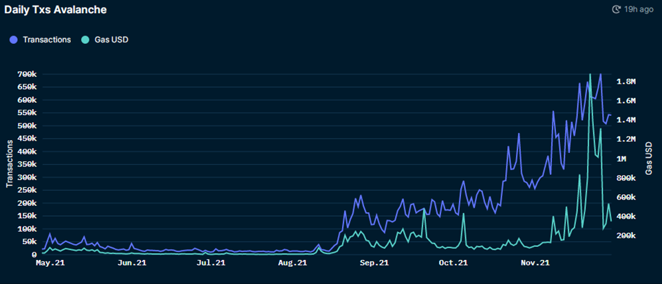 8 月初可以看到每日交易量顯著增加。這正值“Avalanche Rush”計劃的啟動——一項高達1.8億美元的 DeFi 激勵計劃,吸引了藍籌 DeFi 應用在 Avalanche 上部署。此外,在 11 月份還可以看到另一個重大增長,因為在此期間還發布了與德勤的合作伙伴關系等重大公告。此外,隨著最近與領先的數字資產托管和結算解決方案提供商 Fireblocks 的合作,預計未來幾個月的日常交易數量將顯著增加。