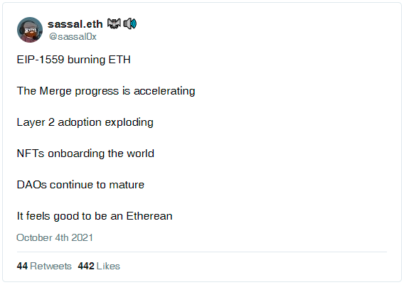 作為一個從 2017 年初就一直在以太坊生態圈的人,我可以肯定地說,我從來沒有像今天這樣對以太坊的未來如此樂觀。經過多年的努力,我們正在看到以太坊 L1 方面 (EIP-1559 和其他主要的升級)、L2 方面 (Rollups 正大步前進) 以及應用層方面 (DeFi、NFTs、DAOs 等等) 的成果。我們正處于以太坊的黃金時代。于我而言,最讓我興奮的是,以太坊生態系統真的像是一個「不夜城」。一天中無論什么時候都有事情發生,且你可以隨時使用以太坊網絡。很明顯,這與互聯網長期以來的運作方式非常相似,但我們從來沒有一個始終開放和去中心化的價值轉移系統——至少對我來說,這是以太坊帶給世界的最令人興奮的創新。讓我們深入探討以太坊中正在發生的一些令人興奮的事情。讓我們從「合并」開始。這方面正在取得驚人的進展,參與以太坊共識層和執行層開發的大多數開發人員現在都在集中精力完成合并。據我所知,有關合并的大多數核心研究已經完成,各客戶團隊正在相關的功能構建方面取得進展 (針對合并的開發者測試網和公開測試網將在未來幾個月上線)。當然,我們距離主網的合并還有一段時間 (2022年第一季度或者第二季度) ,但我相信,研究人員和開發人員將花費盡可能多的時間來確保一切順利和安全進行。畢竟,這將是以太坊歷史上最大的一次升級——我們想把它做好。在過去幾個月里,對整個以太坊生態系統來說,有一件事變得更加清晰了,那就是以太坊將如何實現擴展:Rollups(和零知識技術) 是當前所有可擴展性研究人員/開發人員都在研究的謝林點,且他們似乎也有一個普遍共識,即「模塊化的區塊鏈」設計是以太坊應該努力的方向;在此基礎上,未來我們還將實現數據分片 (data sharding),以增強這些需要大量數據的 Rollups,給予 Rollups 更大的擴展性。盡管在數據分片實現之前,我們已經有了混合解決方案,比如 Validium 和 Volition,它們以一定的安全性為代價 (因為它們將數據放在鏈下),從而實現大規模擴展。與此同時,NFTs(非同質化代幣) 已經成為非加密原生用戶進入 Crypto 領域最好和最簡單的工具。NFTs 的特別之處在于,它們對于新的 Crypto 用戶更加友好,因為 NFTs 生態系統不像 DeFi 那樣充滿了復雜的金融術語。最重要的是,對于普通人而言,NFTs 的收藏和交易要比金融活動更加有趣和直觀 —— 我的意思是,在傳統金融系統中,普通人什么時候會去向什么產品提供流動性呢?不要誤會我的意思,我仍然認為 DeFi 將是一個巨大的市場,但它不會成為大多數人進入 Crypto 領域的「大門」。最后,我們現在有許多不同形式的 DAOs(去中心化自治組織) 存在于以太坊生態系統中,從像 Maker 這樣的老派 DAOs,到“社交代幣” (social token) 生態系統中的新時代 DAOs。不過,這里有一條貫穿線——所有這些 DAOs 都集中于改善全球參與者之間的社會和經濟協調——所有這些 DAOs 都不存在中心化的中介方。當涉及到 DAOs 時,我認為可以采取“百花好放”的方法,這允許人們進行快速實驗、創新并最終取得進展。以上是為何我認為以太坊正處于黃金時代的簡單闡述,我甚至還沒有談及像 DeFi 和新興的社交代幣生態系統。當然,并不是每一個基于以太坊的用例都能獲得長期成功 (1COs 就是其中之一),但作為一個生態系統,我們會隨著時間的推移了解哪些用例是有生命力的,哪些是轉瞬即逝的。因為畢竟,以太坊允許你在世界上任何地方建造任何你想要的東西。