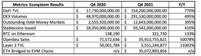 下面的數據顯示了以太坊這個協議和以太坊這個生態系統在20年第四季度和21年第四季度之間的大規模同比增長。所有這些都可以在鏈上找到,供任何人審計。