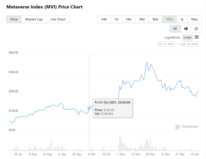 MVI是由Index Coop創建的一籃子元宇宙代幣,從10月1日到2021年12月31日,在該季度結束時上漲了88%,而在11月底達到了197%的峰值。
