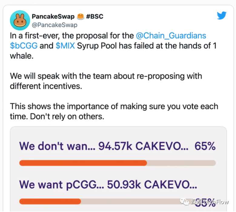 2021年4月,在幣安智能鏈最大的DeFi平臺PancakeSwap上,提交了一份更改池的提案。這一改變(這一改變得到了開發者的支持)被一個鯨魚用戶所推翻,他使用自己的蛋糕代幣承諾了超過94500張選票。這使他成為反對該提案的最大單一選民,并獲得65%的多數支持。持有的代幣數量幾乎是整個提案的兩倍,這只鯨魚憑一己之力阻止了大多數人希望成功的投票。