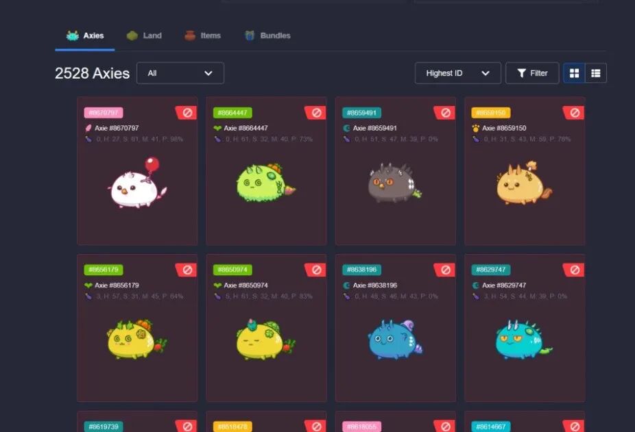 這是騙人的:因為工作室有辦法保持對資產的控制,在大多數情況下,這些游戲仍然是中心化的,盡管許多加密游戲領導者進行了營銷說他們是去中心化的。比如說Axie,有很多Axie被ban了,下圖是被禁用的Axies。